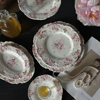 אירופאי פרחים ורוד פרחים פורצלן מודפסת עם עיצוב מובלט גביע וינטג 'וצלחת כלים לחתונה