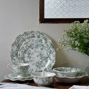 אירופאי בציר פרחים ירוק פרחוני מודפס ארוחת ערב קרמיקה סט בצורת צלחת פרחוני להגדיר עבור אירוע חתונה